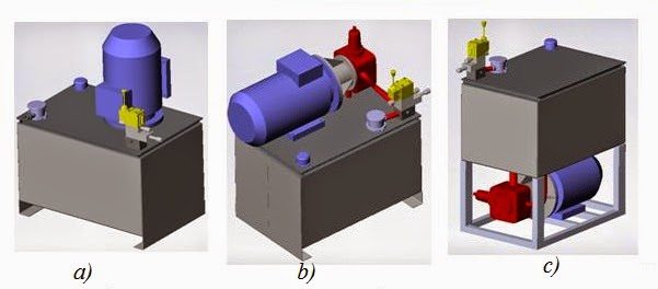 b,c – Trạm máy bơm với cụm motor điện – máy bơm thủy lực nằm ngang. Thường sử dụng khi máy bơm thủy lực là dạng bơm không cố định (máy bơm có khả năng thay đổi lưu lượng).